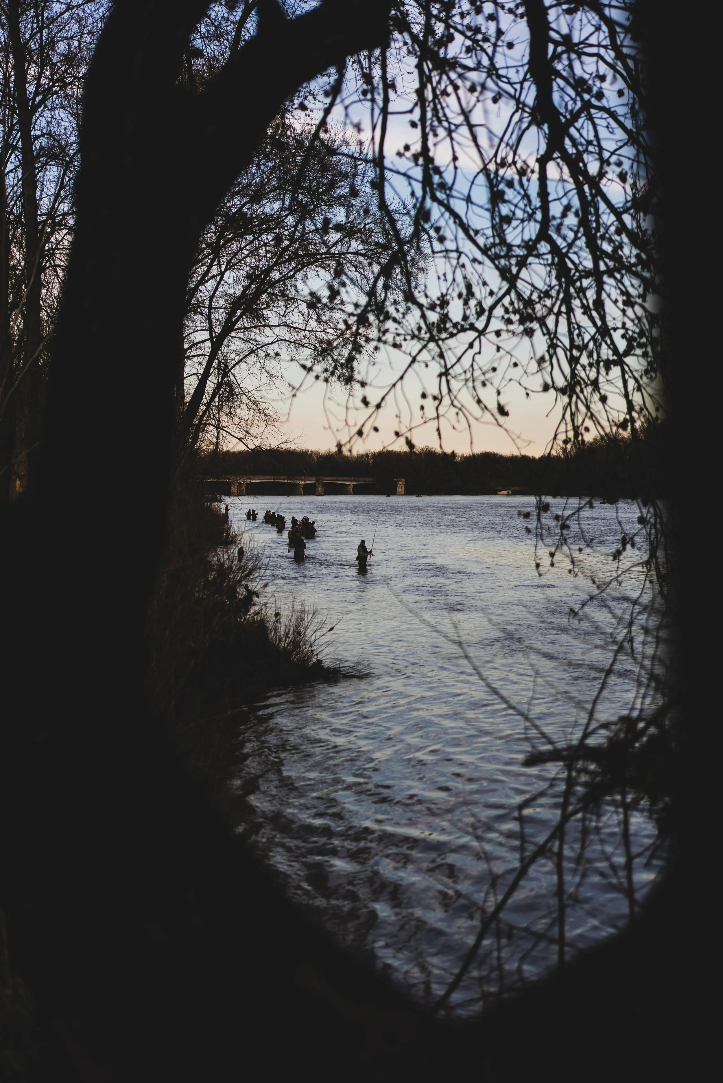 I walk farther down the bank to see a curved row of fishermen standing in the river. Looking east with clear skies turns the Maumee a beautiful blue. Twenty men propped like flannel totems. A short man casts a long line. Just one more catch before sunset. One pricks his finger on a hook, and breathes in sharp. A few drops become passengers in the stream. They talk about the week ahead, but mostly listen. To the trees, birds, and water as it all rushes past.